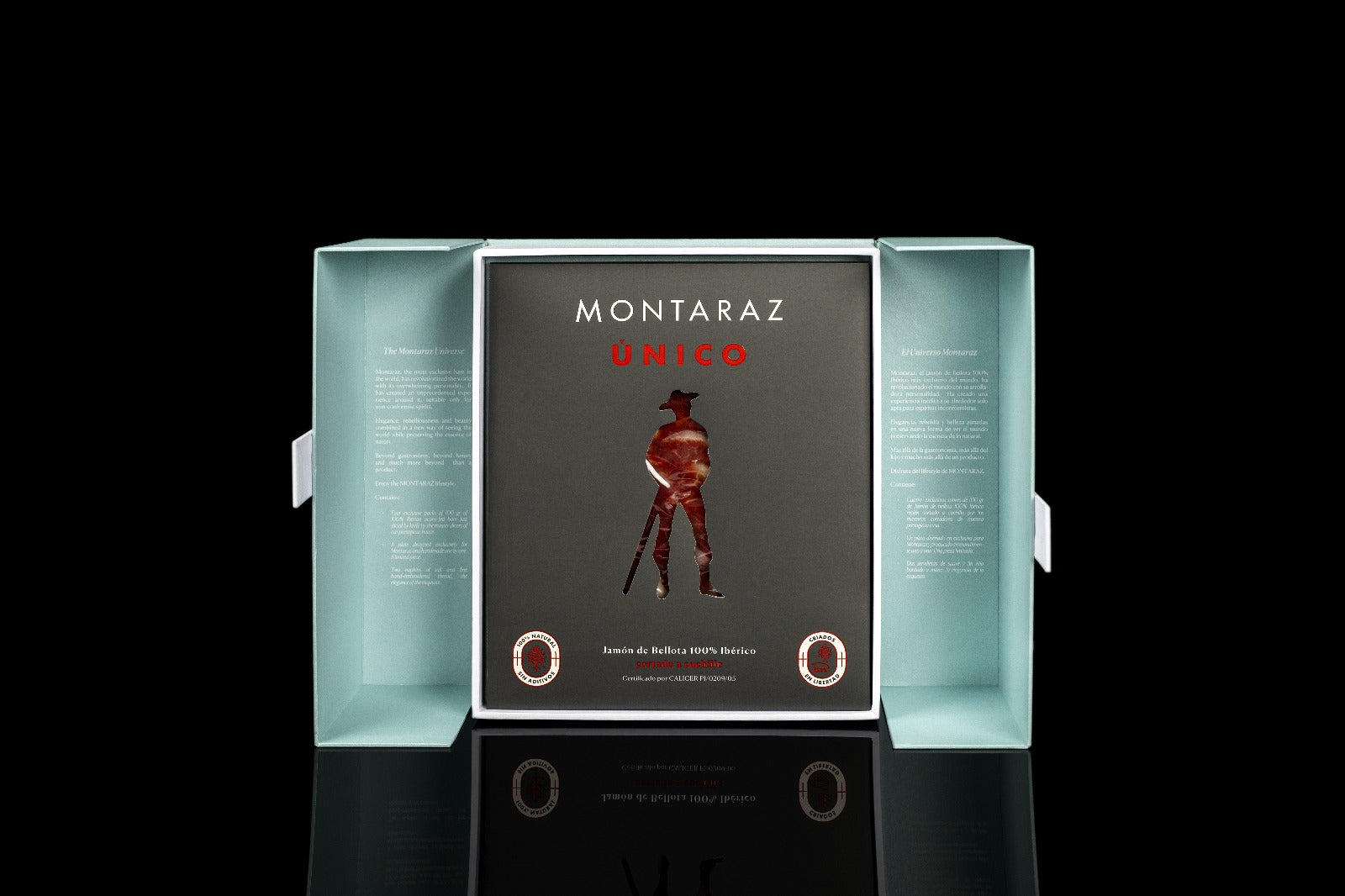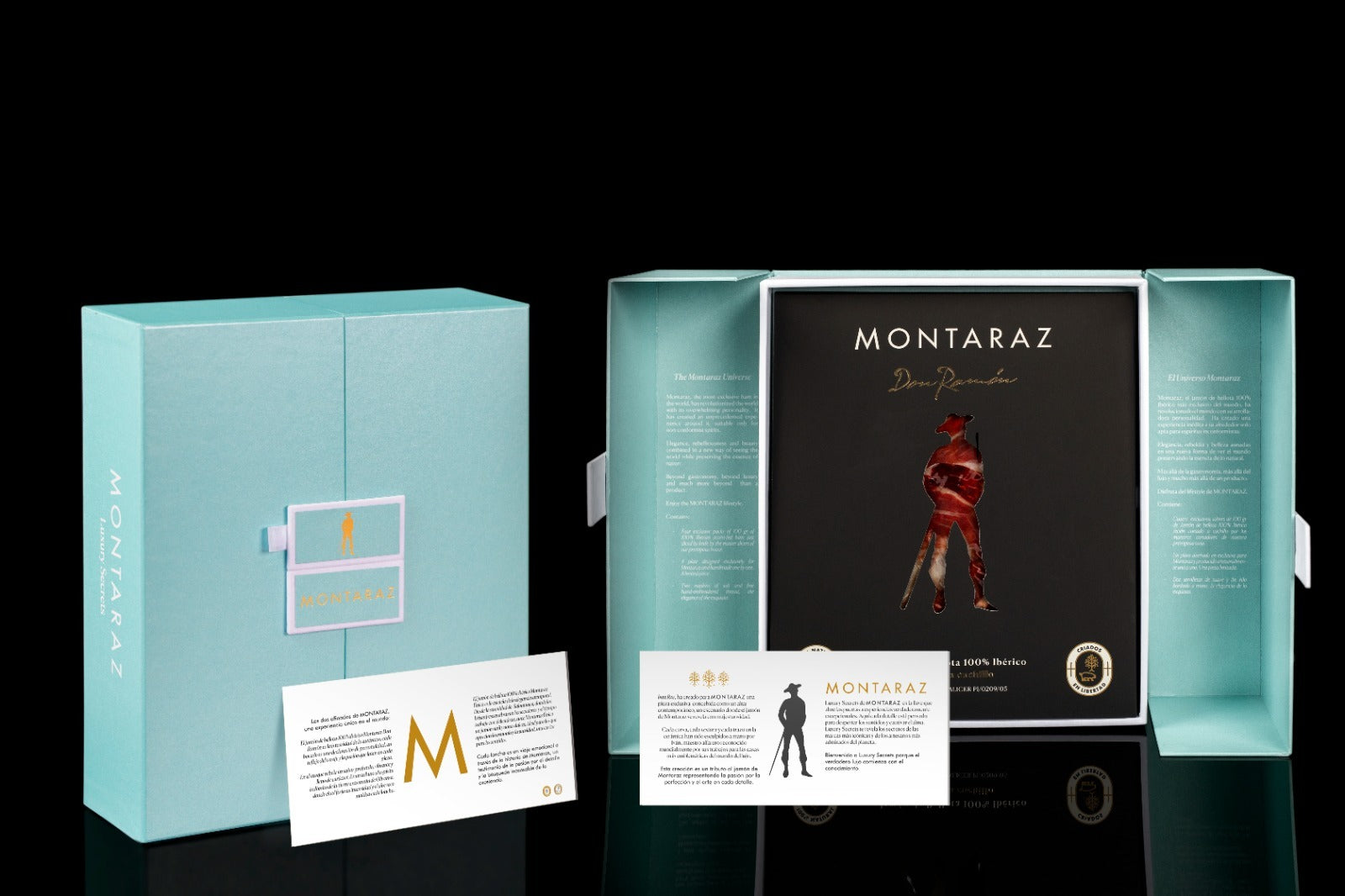 Como las joyas mas deseadas , un cofre de color azul aguamarina con los dos afinados de Montaraz y un cajón secreto que contiene el plato diseñado por Ivan Ros en Exclusiva para Montaraz. Una edición limitada a 250 ud.